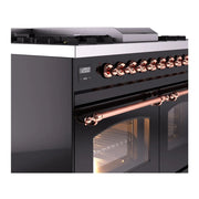 Introducing the new Nostalgie II 40 dual fuel range from ILVE, a classic addition with a touch of innovation to any kitchen. This ILVE 40 inch range Nostalgie features sealed burners equipped with total black brass burners that have a non-stick nanotechnological coating, heavy cast iron grates, 2.3 + 2 cu. ft. dual oven capacity, and a soft closing door system, blending tradition with modern performance.