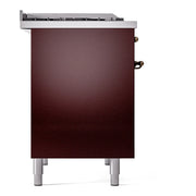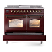 Introducing the new Nostalgie II 40 dual fuel range, a classic addition with a touch of innovation to any kitchen. The ILVE 40 inch range nostalgie features sealed burners equipped with total black brass burners that have a non-stick nanotechnological coating, heavy cast iron grates, 2.3 + 2 cu. ft. dual oven capacity, and a soft closing door system, blending timeless style with modern functionality.