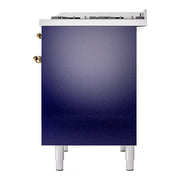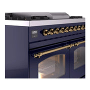 Discover the ILVE 40 inch range Nostalgie II dual fuel range, a classic addition with a touch of innovation to any kitchen. This range features sealed burners equipped with total black brass burners that have a non-stick nanotechnological coating, heavy cast iron grates, 2.3 + 2 cu. ft. dual oven capacity, and a soft closing door system.