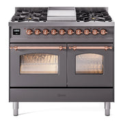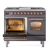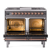 Introducing the ILVE 40 inch range Nostalgie II dual fuel range, a classic addition with a touch of innovation to any kitchen. This range features sealed burners equipped with total black brass burners that have a non-stick nanotechnological coating, heavy cast iron grates, 2.3 + 2 cu. ft. dual oven capacity, and a soft closing door system.