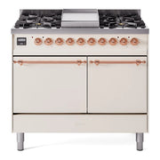 Introducing the new Nostalgie II 40 dual fuel range, the ilve 40 inch range nostalgie, a classic addition with a touch of innovation to any kitchen. This range features sealed burners equipped with total black brass burners that have a non-stick nanotechnological coating, heavy cast iron grates, 2.3 + 2 cu. ft. dual oven capacity, and a soft closing door system.