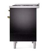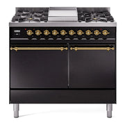 Introducing the new ILVE 40 inch range Nostalgie II dual fuel range, a classic addition with a touch of innovation to any kitchen. This range features sealed burners equipped with total black brass burners that have a non-stick nanotechnological coating, heavy cast iron grates, 2.3 + 2 cu. ft. dual oven capacity, and a soft closing door system.
