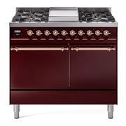 Introducing the new ILVE 40 inch range Nostalgie II dual fuel range, a classic addition with a touch of innovation to any kitchen. This range features sealed burners equipped with total black brass burners that have a non-stick nanotechnological coating, heavy cast iron grates, 2.3 + 2 cu. ft. dual oven capacity, and a soft closing door system.