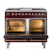 Discover the ILVE 40 inch range Nostalgie, introducing the new Nostalgie II 40 dual fuel range, a classic addition with a touch of innovation to any kitchen. This range features sealed burners equipped with total black brass burners that have a non-stick nanotechnological coating, heavy cast iron grates, 2.3 + 2 cu. ft. dual oven capacity, and a soft closing door system.
