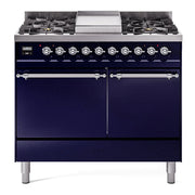 Introducing the new Nostalgie II 40 dual fuel range, a classic addition with a touch of innovation to any kitchen. The ilve 40 inch range nostalgie features sealed burners equipped with total black brass burners that have a non-stick nanotechnological coating, heavy cast iron grates, 2.3 + 2 cu. ft. dual oven capacity, and a soft closing door system.
