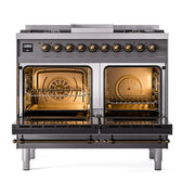 Introducing the new ILVE 40 inch range Nostalgie II dual fuel range, a classic addition with a touch of innovation to any kitchen. This range features sealed burners equipped with total black brass burners that have a non-stick nanotechnological coating, heavy cast iron grates, 2.3 + 2 cu. ft. dual oven capacity, and soft closing door system.