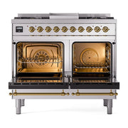 Introducing the new ILVE 40 inch range Nostalgie II dual fuel range, a classic addition with a touch of innovation to any kitchen. This range features sealed burners equipped with total black brass burners that have a non-stick nanotechnological coating, heavy cast iron grates, 2.3 + 2 cu. ft. dual oven capacity, and a soft closing door system, blending timeless style with modern performance.