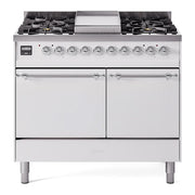 Introducing the new ilve 40 inch range nostalgie, a classic addition with a touch of innovation to any kitchen. This range features sealed burners equipped with total black brass burners that have a non-stick nanotechnological coating, heavy cast iron grates, 2.3 + 2 cu. ft. dual oven capacity, and a soft closing door system.