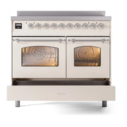 Introducing the new ILVE 40 inch range Nostalgie, a classic addition with a touch of innovation to any kitchen. This range features 6 precise and efficient element zones, heavy cast iron grates, 2.3 + 2 cu. ft. dual oven capacity, and a soft closing door system, blending timeless style with modern performance.
