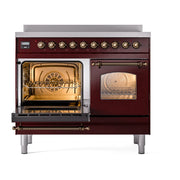 Introducing the new ILVE 40 inch range Nostalgie, a classic addition with a touch of innovation to any kitchen. This range features 6 precise and efficient element zones, heavy cast iron grates, 2.3 + 2 cu. ft. dual oven capacity, and a soft closing door system.
