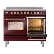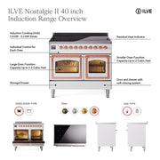 Introducing the new Nostalgie II ilve 40 inch range nostalgie, a classic addition with a touch of innovation to any kitchen. This range features 6 precise and efficient element zones, heavy cast iron grates, 2.3 + 2 cu. ft. dual oven capacity and soft closing door system.