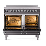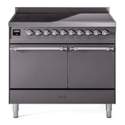 Introducing the new ILVE 40 inch range Nostalgie II induction range, a classic addition with a touch of innovation to any kitchen. This range features 6 precise and efficient element zones, heavy cast iron grates, 2.3 + 2 cu. ft. dual oven capacity, and a soft closing door system.