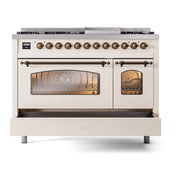 Introducing the new ilve nostalgie range 48 dual fuel range, a classic addition with a touch of innovation to any kitchen. This range features sealed burners equipped with total black brass burners that have a non-stick nanotechnological coating, heavy cast iron grates, 3.5 + 1.52 cu. ft. total double oven capacity, and a soft closing door system.