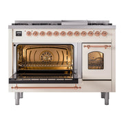 Introducing the new ILVE Nostalgie range 48 dual fuel range, a classic addition with a touch of innovation to any kitchen. This range features sealed burners equipped with total black brass burners that have a non-stick nanotechnological coating, heavy cast iron grates, 3.5 + 1.52 cu. ft. total double oven capacity, and a soft closing door system.
