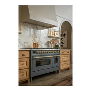 Introducing the new ilve nostalgie range 48 dual fuel range, a classic addition with a touch of innovation to any kitchen. This range features sealed burners equipped with total black brass burners that have a non-stick nanotechnological coating, heavy cast iron grates, 3.5 + 1.52 cu. ft. total double oven capacity, and a soft closing door system.
