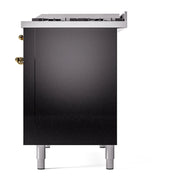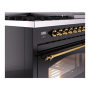 Introducing the new ILVE Nostalgie Range 48 dual fuel range, a classic addition with a touch of innovation to any kitchen. This range features sealed burners equipped with total black brass burners that have a non-stick nanotechnological coating, heavy cast iron grates, 3.5 + 1.52 cu. ft. total double oven capacity, and a soft closing door system.