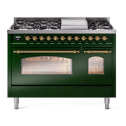 Introducing the new ILVE Nostalgie Range 48 dual fuel range, a classic addition with a touch of innovation to any kitchen. This range features sealed burners equipped with total black brass burners that have a non-stick nanotechnological coating, heavy cast iron grates, 3.5 + 1.52 cu. ft. total double oven capacity, and a soft closing door system.