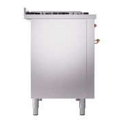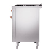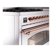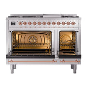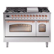Introducing the new ilve nostalgie range 48, a classic addition with a touch of innovation to any kitchen. This dual fuel range features sealed burners equipped with total black brass burners that have a non-stick nanotechnological coating, heavy cast iron grates, 3.5 + 1.52 cu. ft. total double oven capacity, and a soft closing door system, blending timeless style with modern efficiency.