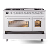 Discover the ILVE Nostalgie range 48, introducing the new Nostalgie II 48 dual fuel range as a classic addition with a touch of innovation to any kitchen. This range features sealed burners equipped with total black brass burners that have a non-stick nanotechnological coating, heavy cast iron grates, 3.5 + 1.52 cu. ft. total double oven capacity, and a soft closing door system for effortless operation.