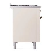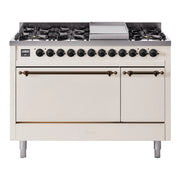 Introducing the new ILVE Nostalgie Range 48 dual fuel range, a classic addition with a touch of innovation to any kitchen. This range features sealed burners equipped with total black brass burners that have a non-stick nanotechnological coating, heavy cast iron grates, 3.5 + 1.52 cu. ft. total double oven capacity, and a soft closing door system.