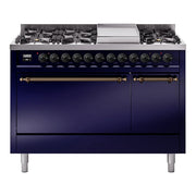 Introducing the new Nostalgie II 48 dual fuel range, a classic addition with a touch of innovation to any kitchen. The ILVE Nostalgie range 48 features sealed burners equipped with total black brass burners that have a non-stick nanotechnological coating, heavy cast iron grates, 3.5 + 1.52 cu. ft. total double oven capacity, and a soft closing door system, blending timeless style with modern functionality.