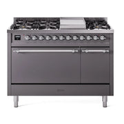 Introducing the new ILVE Nostalgie Range 48 dual fuel range, a classic addition with a touch of innovation to any kitchen. This range features sealed burners equipped with total black brass burners that have a non-stick nanotechnological coating, heavy cast iron grates, 3.5 + 1.52 cu. ft. total double oven capacity, and a soft closing door system.