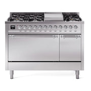 Introducing the new ILVE Nostalgie range 48 dual fuel range, a classic addition with a touch of innovation to any kitchen. This range features sealed burners equipped with total black brass burners that have a non-stick nanotechnological coating, heavy cast iron grates, 3.5 + 1.52 cu. ft. total double oven capacity, and a soft closing door system.