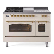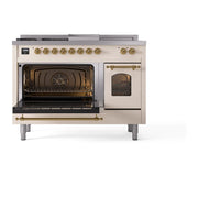 Introducing the new ilve nostalgie range 48, a classic addition with a touch of innovation to any kitchen. This dual fuel range features sealed burners equipped with total black brass burners that have a non-stick nanotechnological coating, heavy cast iron grates, 3.5 + 1.52 cu. ft. total double oven capacity, and a soft closing door system.