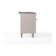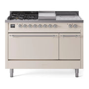 Introducing the new ILVE Nostalgie Range 48 dual fuel range, a classic addition with a touch of innovation to any kitchen. This range features sealed burners equipped with total black brass burners that have a non-stick nanotechnological coating, heavy cast iron grates, 3.5 + 1.52 cu. ft. total double oven capacity, and a soft closing door system, blending timeless style with modern performance for effortless cooking.