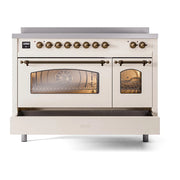 Introducing the new ilve nostalgie range 48 induction range, a classic addition with a touch of innovation to any kitchen. This range features 6 precise and efficient element zones with booster function, overheating and liquid spill protection, 3.5 + 1.52 cu. ft. dual oven capacity, and soft closing door system.