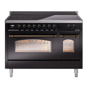 Introducing the new ilve nostalgie range 48 induction range, a classic addition with a touch of innovation to any kitchen. This range features 6 precise and efficient element zones with booster function, overheating and liquid spill protection, 3.5 + 1.52 cu. ft. dual oven capacity and soft closing door system.