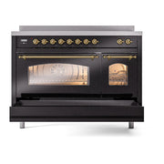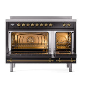 Introducing the new Nostalgie II 48 induction range, the ilve nostalgie range 48, a classic addition with a touch of innovation to any kitchen. This range features 6 precise and efficient element zones with booster function, overheating and liquid spill protection, 3.5 + 1.52 cu. ft. dual oven capacity and soft closing door system.
