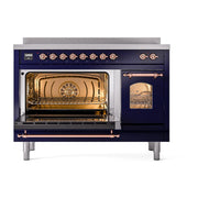 Introducing the new ILVE Nostalgie range 48 induction range, a classic addition with a touch of innovation to any kitchen. This range features 6 precise and efficient element zones with booster function, overheating and liquid spill protection, 3.5 + 1.52 cu. ft. dual oven capacity and soft closing door system.