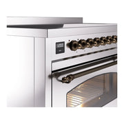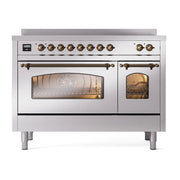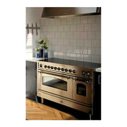 Introducing the new ILVE Nostalgie range 48 induction range, a classic addition with a touch of innovation to any kitchen. This range features 6 precise and efficient element zones with booster function, overheating and liquid spill protection, 3.5 + 1.52 cu. ft. dual oven capacity, and soft closing door system, making it an ideal choice for modern cooking needs.