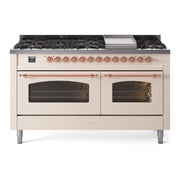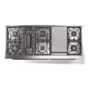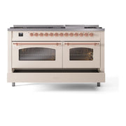 Introducing the new ilve nostalgie 60 dual fuel range, a classic addition with a touch of innovation to any kitchen. This range features sealed burners equipped with total black brass burners that have a non-stick nanotechnological coating, heavy cast iron grates, 3.5 + 2.3 cu. ft. dual oven capacity, and a soft closing door system.