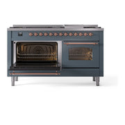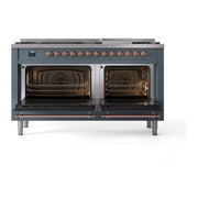 Introducing the new ILVE Nostalgie 60 dual fuel range, a classic addition with a touch of innovation to any kitchen. This range features sealed burners equipped with total black brass burners that have a non-stick nanotechnological coating, heavy cast iron grates, 3.5 + 2.3 cu. ft. dual oven capacity, and a soft closing door system, blending timeless style with modern functionality.