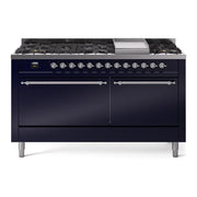 Introducing the new ilve nostalgie 60 dual fuel range, a classic addition with a touch of innovation to any kitchen. This range features sealed burners equipped with total black brass burners that have a non-stick nanotechnological coating, heavy cast iron grates, 3.5 + 2.3 cu. ft. dual oven capacity, and a soft closing door system.