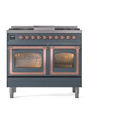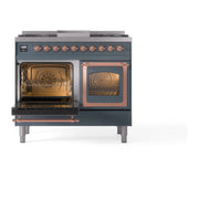 Introducing the new ILVE 40 inch range Nostalgie II dual fuel range, a classic addition with a touch of innovation to any kitchen. This ILVE 40 inch range Nostalgie features sealed burners equipped with total black brass burners that have a non-stick nanotechnological coating, heavy cast iron grates, 2.3 + 2 cu. ft. dual oven capacity, and a soft closing door system.