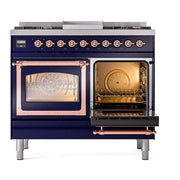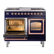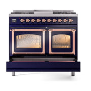 Introducing the new ILVE 40 inch range Nostalgie II dual fuel range, a classic addition with a touch of innovation to any kitchen. This range features sealed burners equipped with total black brass burners that have a non-stick nanotechnological coating, heavy cast iron grates, 2.3 + 2 cu. ft. dual oven capacity, and a soft closing door system.
