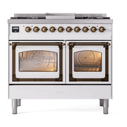 Introducing the new Nostalgie II ILVE 40 inch range Nostalgie, a classic addition with a touch of innovation to any kitchen. This range features sealed burners equipped with total black brass burners that have a non-stick nanotechnological coating, heavy cast iron grates, 2.3 + 2 cu. ft. dual oven capacity, and a soft closing door system.