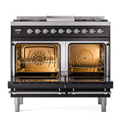 Introducing the new ILVE 40 inch range Nostalgie II 40 dual fuel range, a classic addition with a touch of innovation to any kitchen. This range features sealed burners equipped with total black brass burners that have a non-stick nanotechnological coating, heavy cast iron grates, 2.3 + 2 cu. ft. dual oven capacity, and a soft closing door system, blending timeless style with modern efficiency.