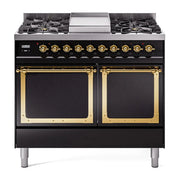 Introducing the new Nostalgie II ilve 40 inch range nostalgie, a classic addition with a touch of innovation to any kitchen. This range features sealed burners equipped with total black brass burners that have a non-stick nanotechnological coating, heavy cast iron grates, 2.3 + 2 cu. ft. dual oven capacity, and a soft closing door system, blending timeless style with modern efficiency for effortless cooking.