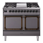 Introducing the new Nostalgie II 40 dual fuel range, a classic addition with a touch of innovation to any kitchen, the ILVE 40 inch range Nostalgie elevates your cooking experience. This range features sealed burners equipped with total black brass burners that have a non-stick nanotechnological coating, heavy cast iron grates, 2.3 + 2 cu. ft. dual oven capacity, and soft closing door system for effortless daily use.