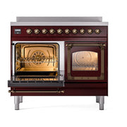 Introducing the new Nostalgie II 40 induction range, a classic addition with a touch of innovation to any kitchen. The ILVE 40 inch range Nostalgie features 6 precise and efficient element zones, heavy cast iron grates, 2.3 + 2 cu. ft. dual oven capacity, and a soft closing door system, blending timeless style with modern performance.