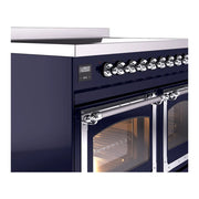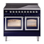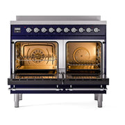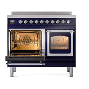 Introducing the new Nostalgie II 40 induction range, a classic addition with a touch of innovation to any kitchen. This ilve 40 inch range nostalgie features 6 precise and efficient element zones, heavy cast iron grates, 2.3 + 2 cu. ft. dual oven capacity, and a soft closing door system that elevates everyday cooking with style and functionality.