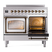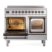 Introducing the new Nostalgie II ilve 40 inch range nostalgie, a classic addition with a touch of innovation to any kitchen. This range features 6 precise and efficient element zones, heavy cast iron grates, 2.3 + 2 cu. ft. dual oven capacity, and a soft closing door system.