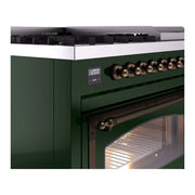 Introducing the new ilve nostalgie range 48, a classic addition with a touch of innovation to any kitchen. This dual fuel range features sealed burners equipped with total black brass burners that have a non-stick nanotechnological coating, heavy cast iron grates, 3.5 + 1.52 cu. ft. total double oven capacity, and a soft closing door system.