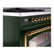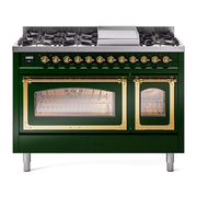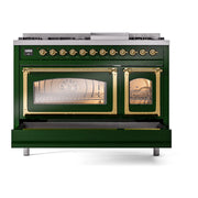 Introducing the new ILVE Nostalgie Range 48 dual fuel range, a classic addition with a touch of innovation to any kitchen. This range features sealed burners equipped with total black brass burners that have a non-stick nanotechnological coating, heavy cast iron grates, 3.5 + 1.52 cu. ft. total double oven capacity, and a soft closing door system.