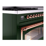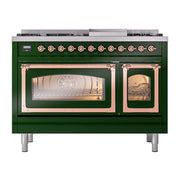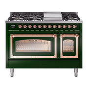 Introducing the new ILVE Nostalgie Range 48 dual fuel range, a classic addition with a touch of innovation to any kitchen. This range features sealed burners equipped with Total Black Brass burners that have a non-stick nanotechnological coating, heavy cast iron grates, 3.5 + 1.52 cu. ft. total double oven capacity, and a soft closing door system.
