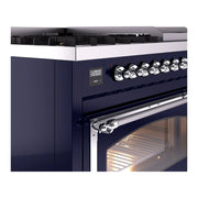 Introducing the new ilve nostalgie range 48, a classic addition with a touch of innovation to any kitchen. This dual fuel range features sealed burners equipped with total black brass burners that have a non-stick nanotechnological coating, heavy cast iron grates, 3.5 + 1.52 cu. ft. total double oven capacity, and a soft closing door system.